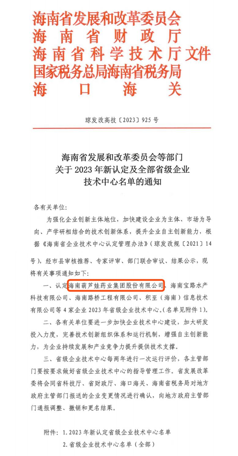 近日,海南省发改委等多部门联合公布了《关于2023年新认定及全部省级企业技术中心名单的通知》,其中,海南尊龙药业集团股份有限公司成功通过评审,被认定为省级企业技术中心,是本次获批的4家企业之一。